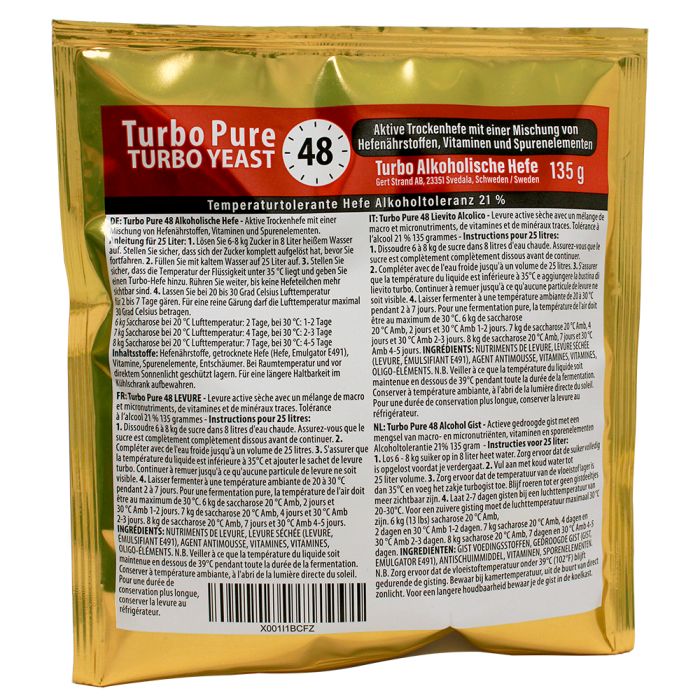 Jeder Beutel reicht für Zuckersirup oder Honig (jeweils 25 Liter), Obstmaischen (100 Liter) oder Maischen auf der Grundlage von Stärke (50 Liter) mit jeweils maximal 320 g Zucker je Liter zwecks Herstellung von Alkohol von maximal 20%. Eigenschaften und Anwendung des erzeugten Alkohols: